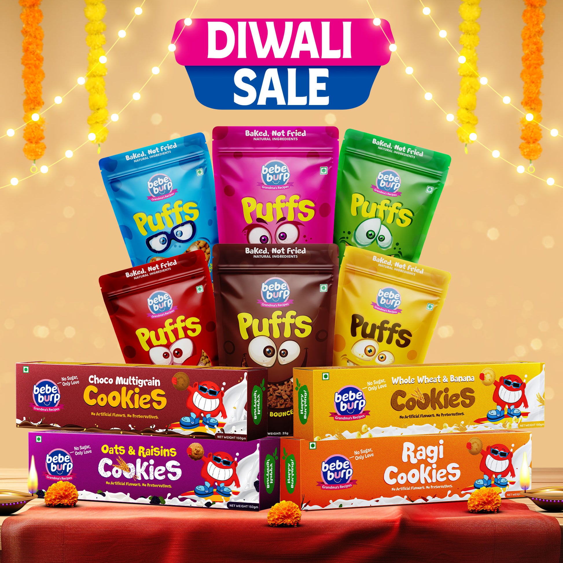 Puffs: A nutritious blend of soya, jowar, multigrain, and quinoa flours combined with natural spices and seasonings.