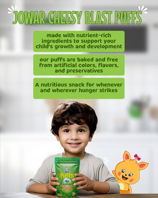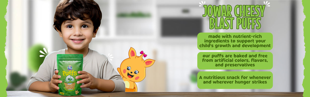 🔥 Baked to perfection, our puffs retain the wholesome benefits of jowar while being low in fat, offering a crunchy and satisfying snack for kids to enjoy guilt-free.