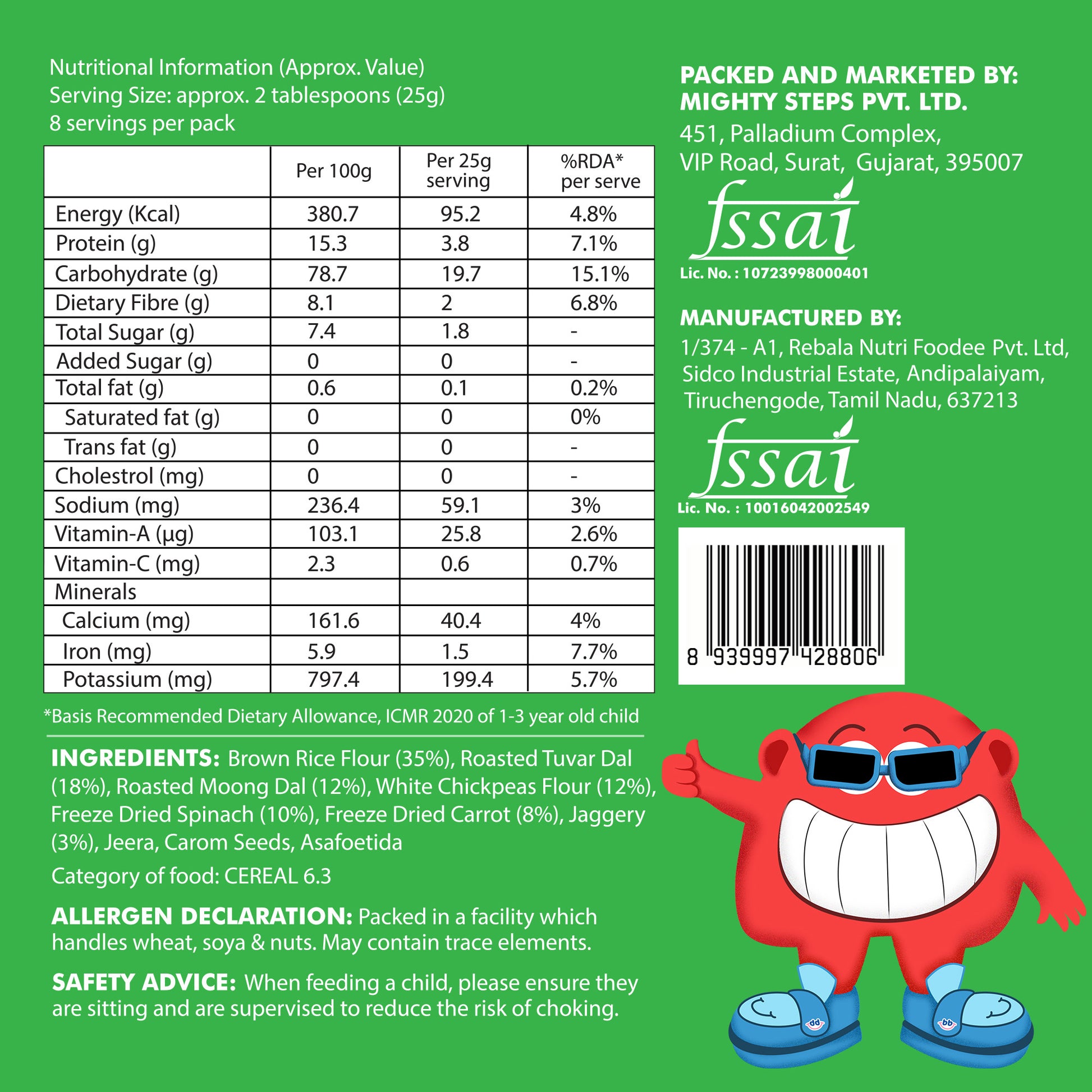 Brown Rice Flour Coarse, White Chick Pea Flour, Freeze Dried Spinach powder, Roasted Cumin Powder, Jaggery Powder, Roasted Toor Daal Flour, Freeze Dried Carrot Powder