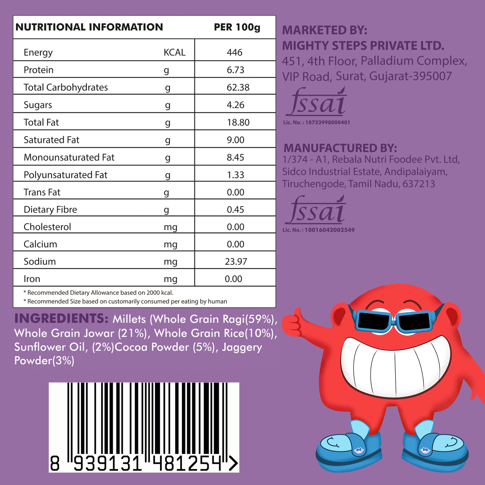 Whole Grain Ragi (59%), Whole Grain Jowar (21%), Whole Grain Rice (10%), Sunflower Oil (2%), Cocoa Powder (5%), Jaggery Powder (3%)