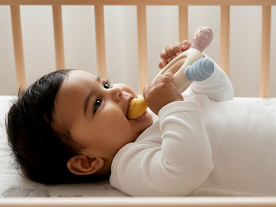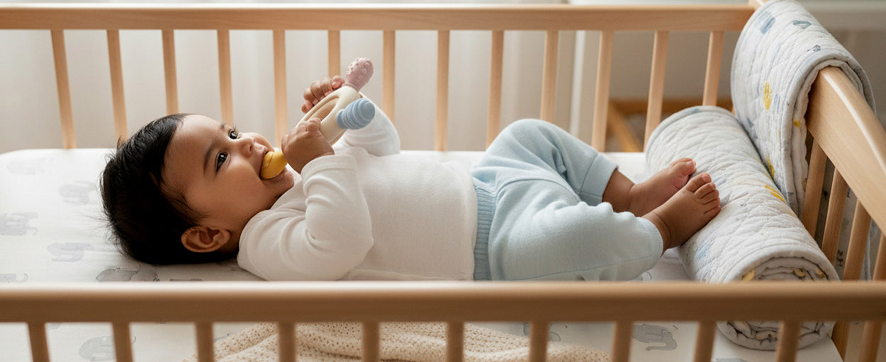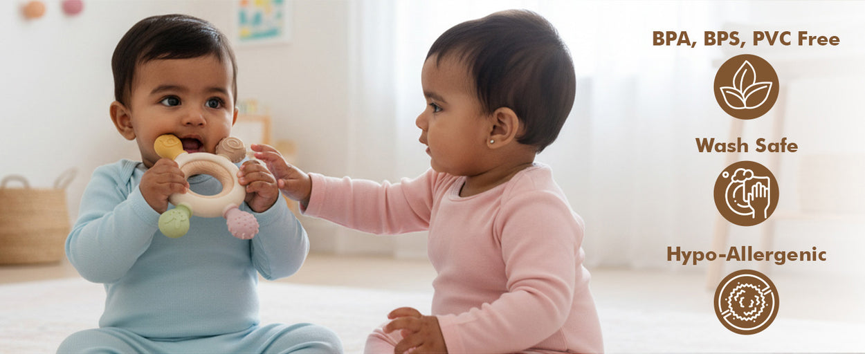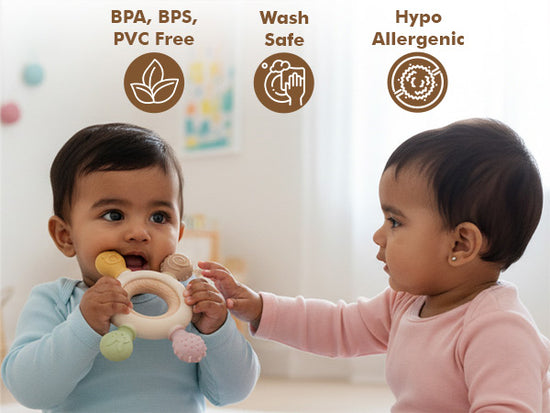 Ans: This teether combines soft food-grade silicone and natural beech wood, giving babies a safe, non-toxic, and eco-friendly alternative to plastic teethers. It’s gentle on gums and easy to hold.