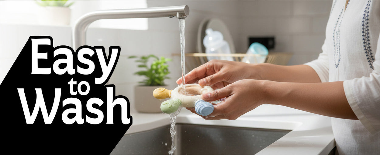 Ans: It’s best to wash the teether daily or after every use to maintain hygiene, especially if your baby drops it frequently.